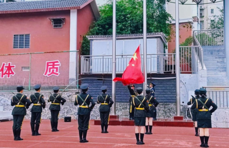7时许,升旗仪式正式开始。在全体师生的注目下,校国旗护卫队迈着铿锵有力的步伐,护送五星红旗缓缓走向升旗台;伴随着庄严的中华人民共和国国歌,五星红旗冉冉升起,迎风招展。