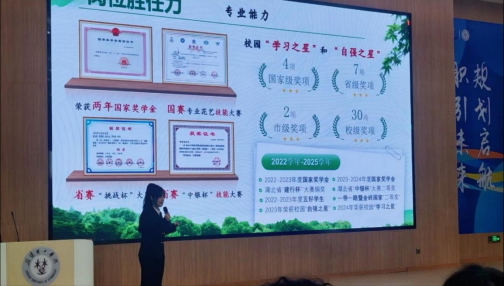 大赛中,谢蒙蒙以“成为一名优秀的植物科普讲解员”作为参赛主题,紧扣岗位要求,全面地讲述了自身职业目标与实践路径。植物科普讲解员岗位广泛分布于科技馆、植物园、教育机构等多个领域,对从业者的综合素养提出了很高要求——不仅需要扎实的植物学专业知识储备,还须具备出色的表达沟通能力、亲和力、临场应变能力以及持续学习与创新的能力。在现场陈述环节,谢蒙蒙坚定表示,未来将致力于以通俗易懂、生动有趣的形式,向公众尤其是青少年群体普及植物学知识,助力提升全社会科学素养。